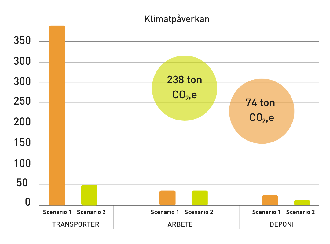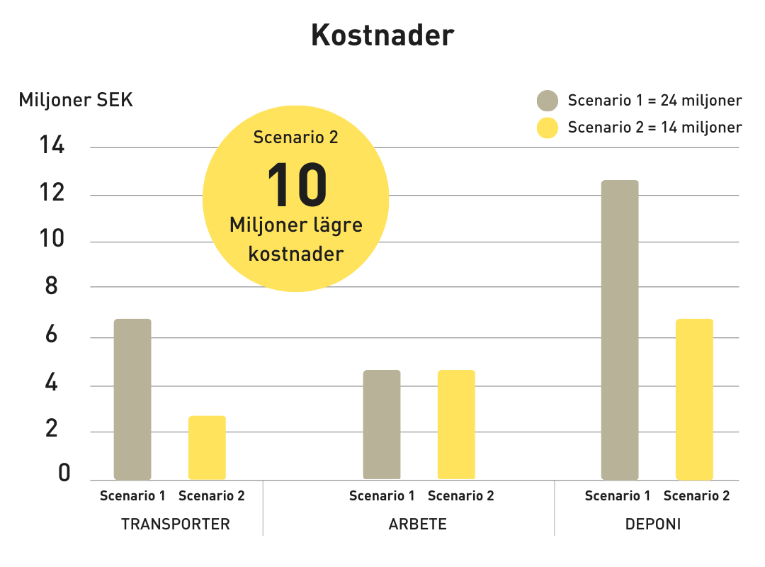 Bilden illustrerar skillnaden mellan två masshanteringsscenarier och hur dessa påverkar kostnaderna på olika sätt. Det är enkelt att se att projektet kan spara 10 miljoner kronor genom att välja att genomföra masshantering i enlighet med scenario 2.